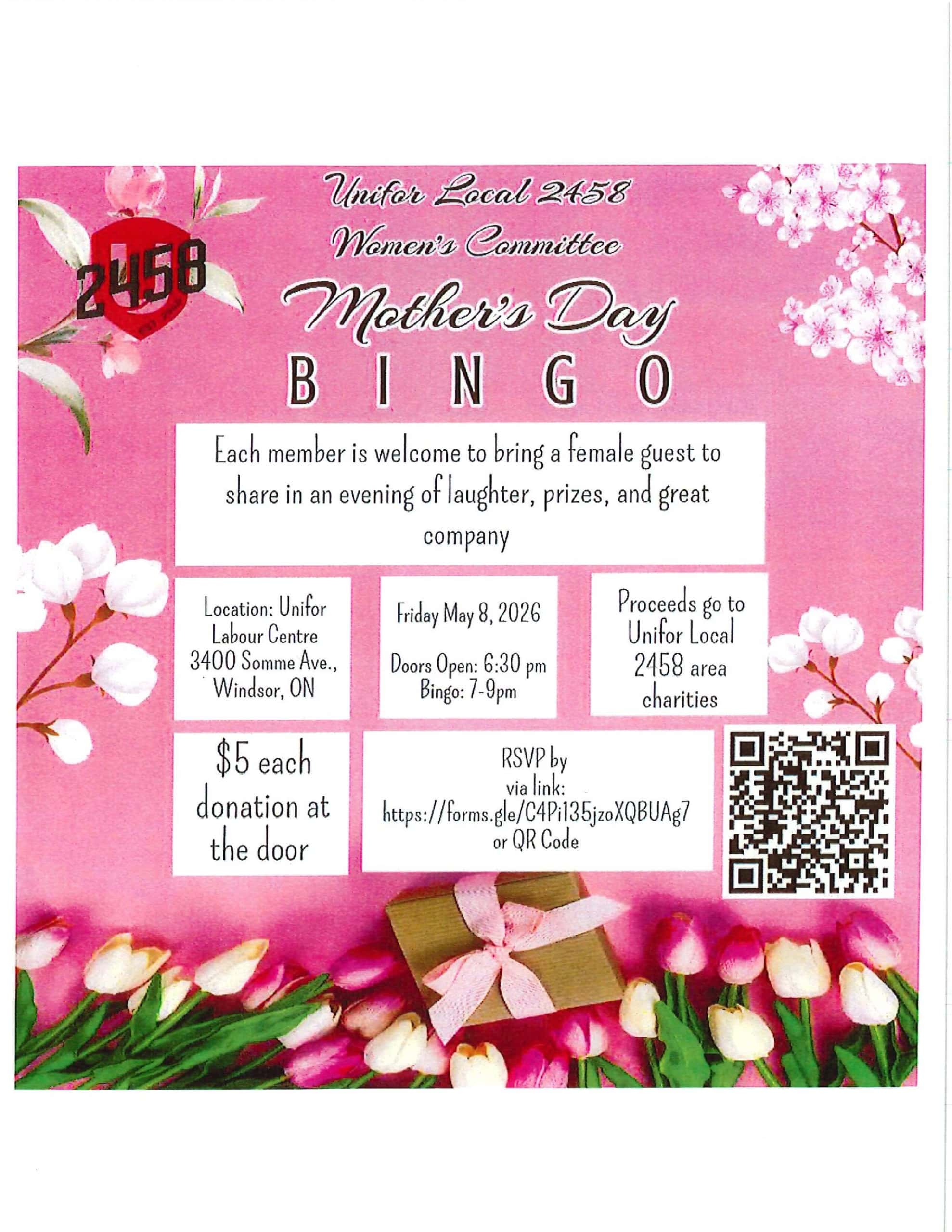 Join the Unifor Local 2458 Women’s Committee for a fun-filled evening celebrating Mother’s Day! Each member is welcome to bring a female guest to enjoy a night of laughter, prizes, and great company. 🚪 […]
